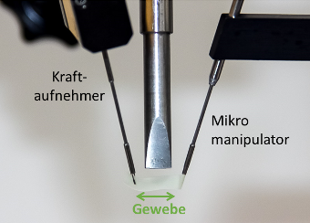 Fig. F3: Arrangement for measuring the fluorescence of tissue that is moved by micromanipulators with nano-forces /3/